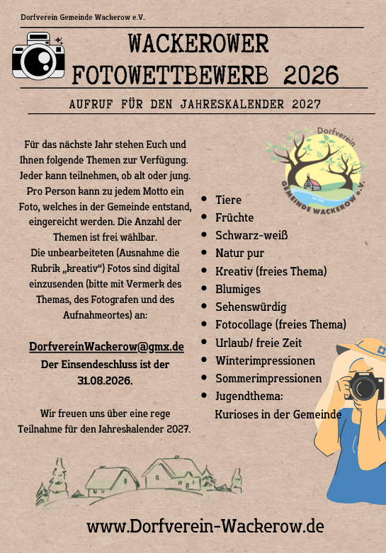 Reicht eure Fotos unter der Mailadresse info@dorfverein-wackerow.de ein.